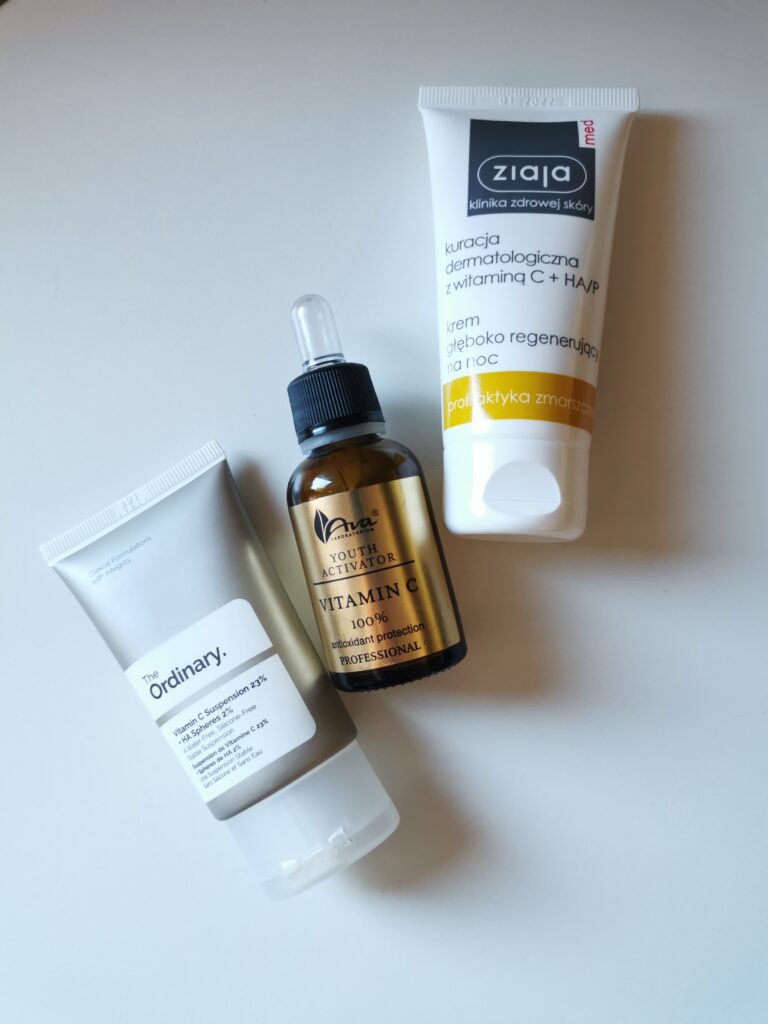 Na co dzień używam przede wszystkim serum, głównie Witaminy C z Acerolą od Ava Laboratoria – szybko się wchłania, jest idealna pod makijaż i krem z filtrem. Drugi ulubiony produkt to Regenerująca Kuracja z Witaminą C marki Dermofuture – o nieco cięższej, bardziej oleistej konsystencji, odpowiedniej na noc. Oprócz tego na mojej półce co jakiś czas gości Kuracja Dermatologiczna z Witaminą C + HA/P Ziaja Med, którą stosuję w formie maski (nakładam wieczorem, zmywam rano).